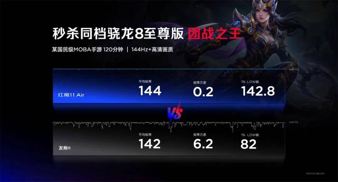 在144Hz高清画质下运行120分钟某国民级MOBA手游。红魔11 Air平均帧率为144帧,1%LOW帧为142.8帧,对比机型平均帧率为142帧,1%LOW帧为82帧。