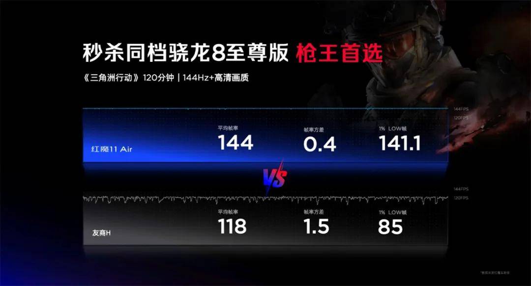 在发布会上,红魔官方也展示了红魔11 Air的游戏实测水平。在144Hz高清画质下运行120分钟《三角洲行动》,红魔11 Air平均帧率为144帧,1%LOW帧为141.1帧,对比机型平均帧率为118帧,1%LOW帧为85帧。