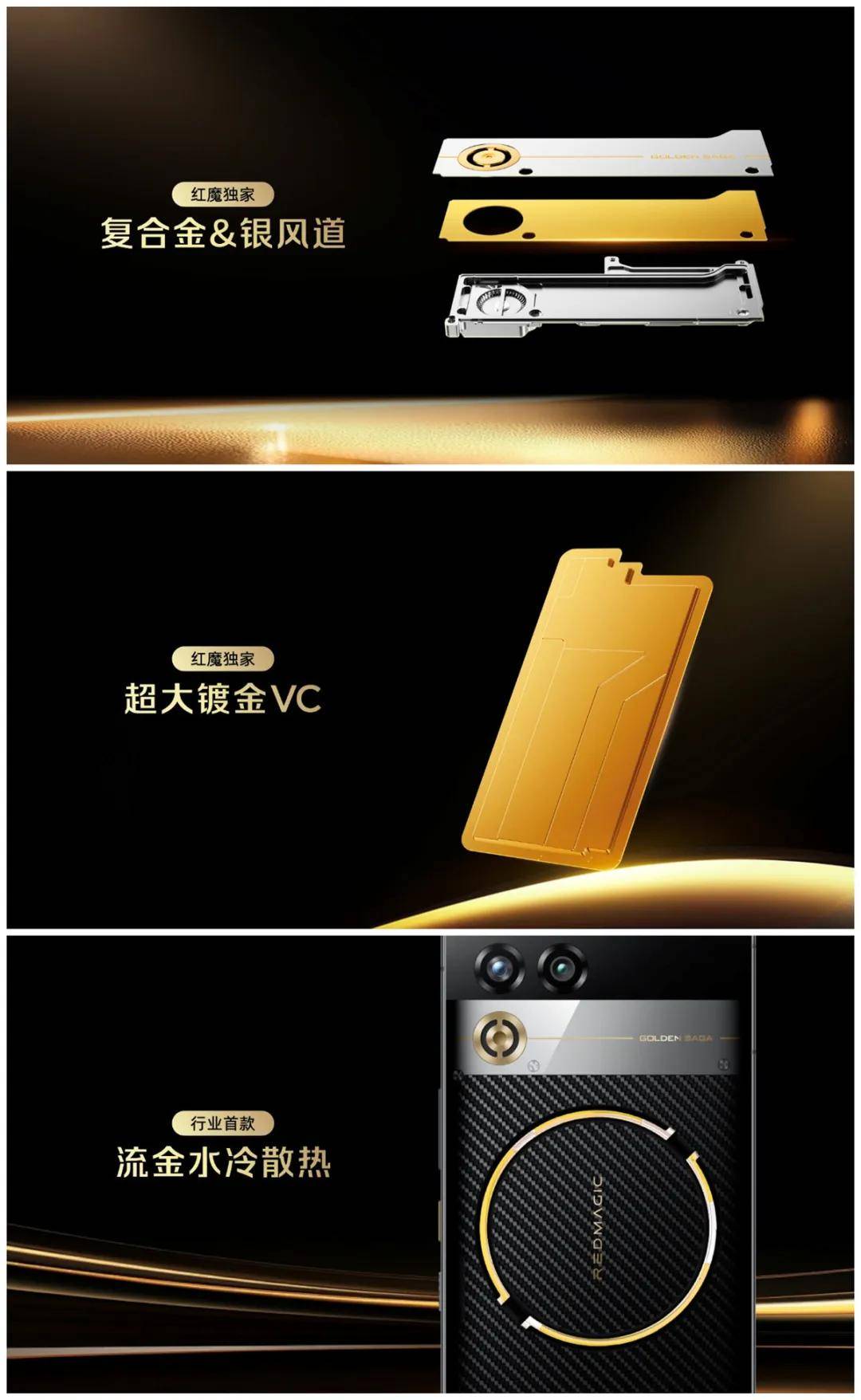 散热方面,红魔发挥金稳定耐久与银导热迅速的优势,带来金银复合散热架构,同时搭载了超大镀金VC均热板,让高性能持续稳定释放,全程稳定输出。同时升级的还有脉动水冷引擎,红魔11Pro+臻金传奇版采用全新的流金水冷,让性能和美学合二为一,将“风生水起”的产品设计理念延续保留。