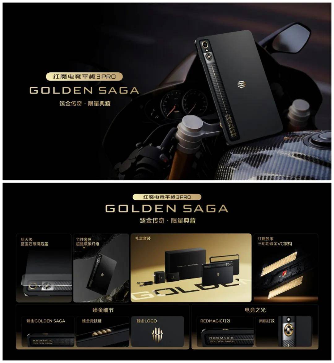 同时红魔为追求顶级电竞体验与奢华质感的玩家,也带来了红魔电竞平板3Pro 臻金传奇。机身材质同样融合了碳纤维材质与航天级蓝宝石玻璃后盖。机身内部采用镀金VC散热模块,灯效、LOGO、竞技键等都进行了细节处理,让平板也能拥有臻金质感。