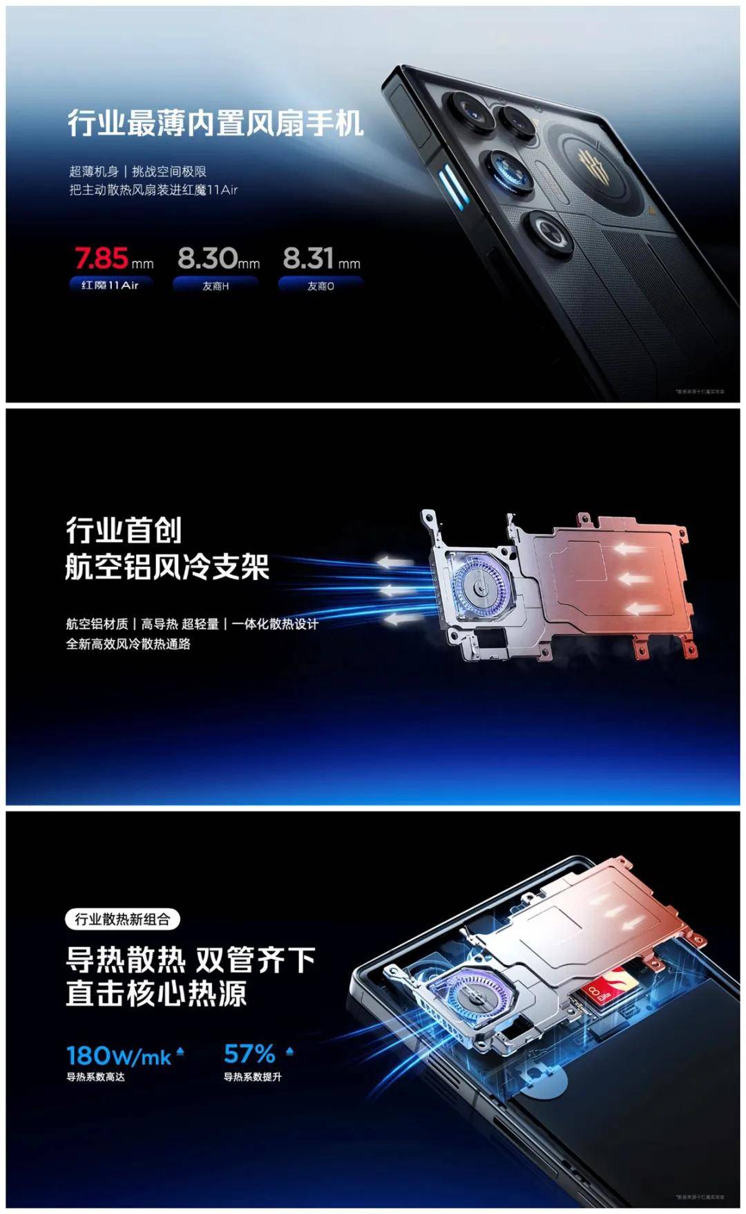 红魔11 Air这一次直接在Air机型上,首次搭载了主动散热风扇——驭风4.0,可实现每分钟24000转持续转速。