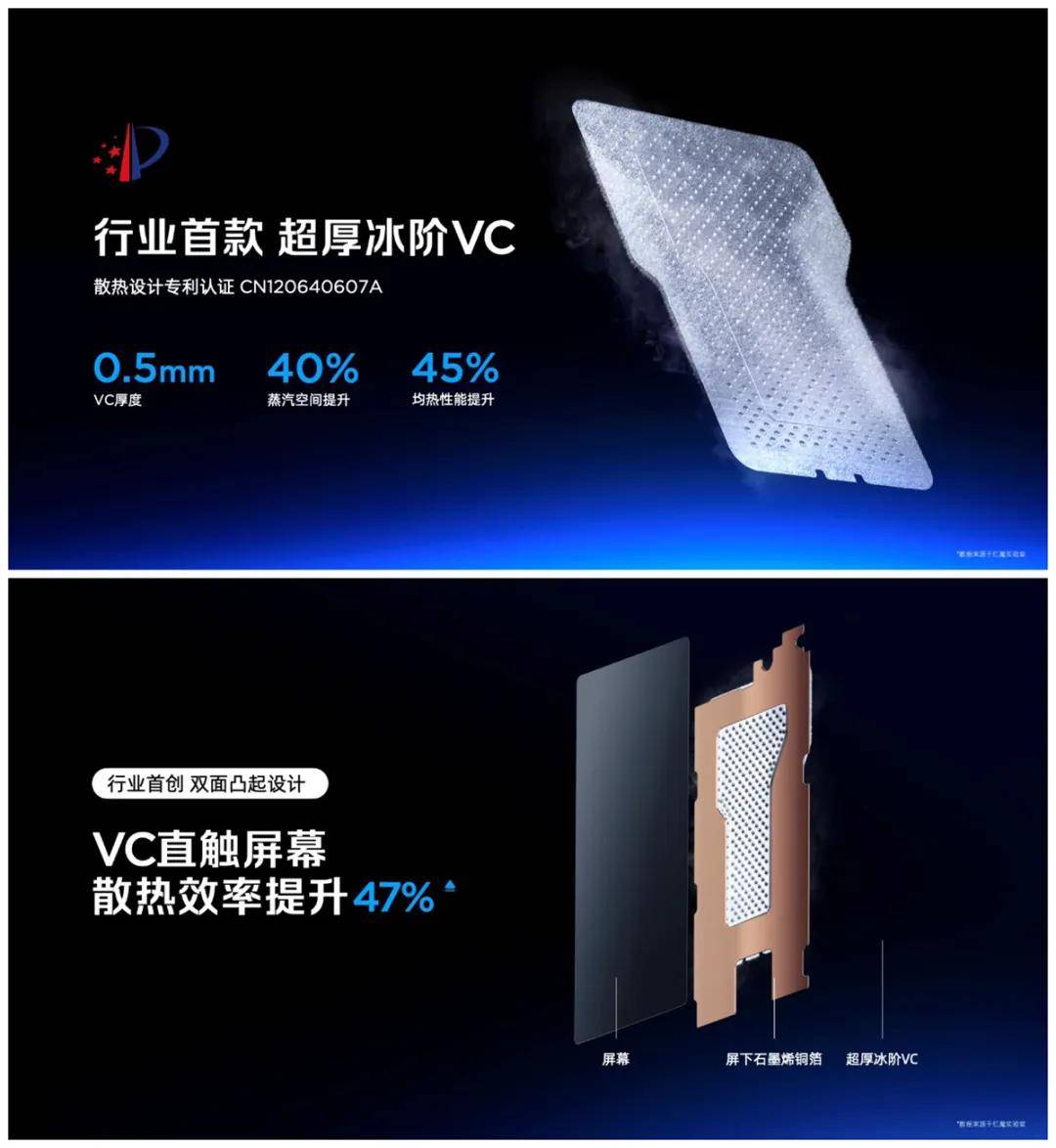除了主动散热之外,红魔也带来了行业首款超厚冰阶VC,通过结构加厚与双面凸起设计,让蒸汽空间提升了40%,均热能力提升45%。同时也让VC均热板直触屏幕,散热效率提升了47%。