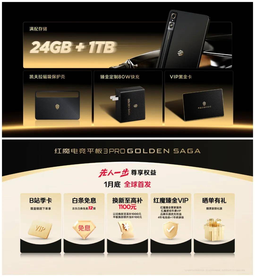 而红魔电竞平板3 Pro臻金传奇同样搭载24GB+1TB的顶配存储组合,配备红魔 11 Pro+臻金传奇同款臻金装备,预计1月底全球首发,上京东先人一步首销尊享B站季卡、12期白条免息、以旧换新至高补贴1100元,红魔臻金VIP、晒单有礼等权益。