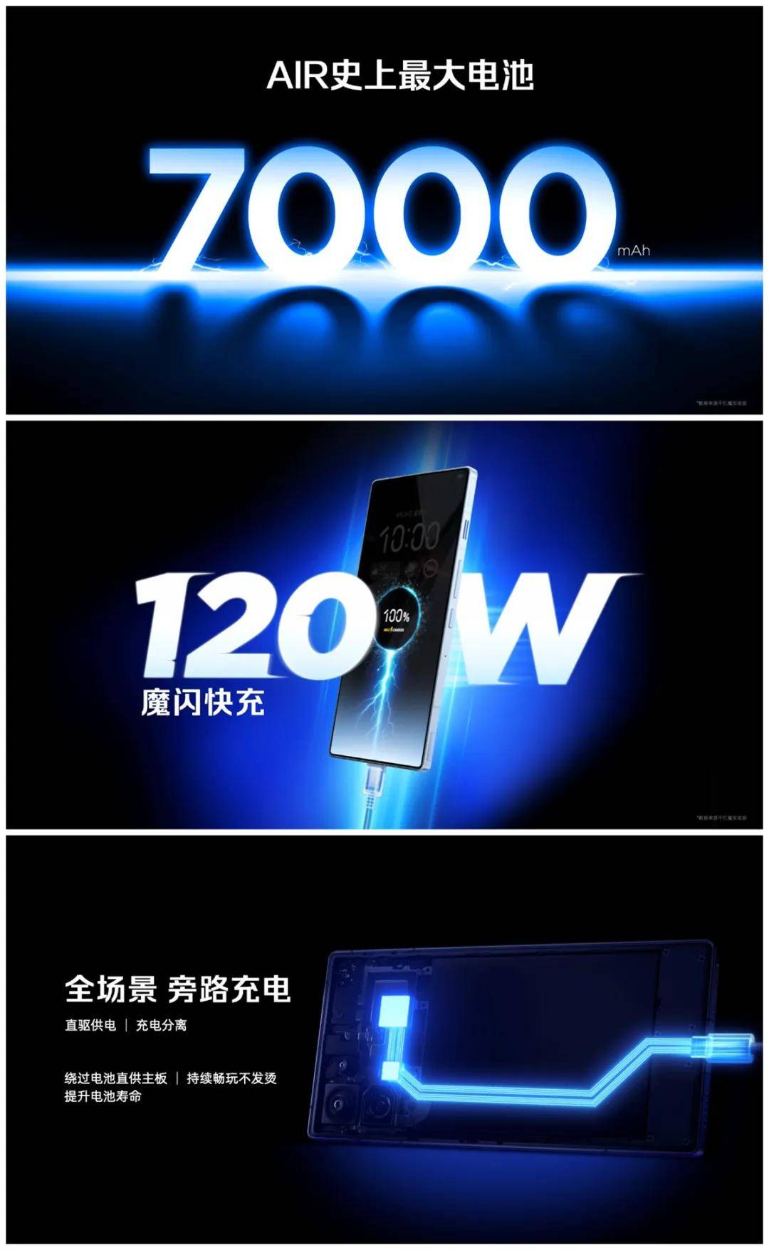 Air机型普遍的续航焦虑在红魔11 Air上也不存在。红魔11 Air搭载了Air史上最大电池,达到7000mAh。同时搭配120W魔闪快充与全场景旁路供电技术,不仅兼顾续航,也能有效保护电池寿命。
