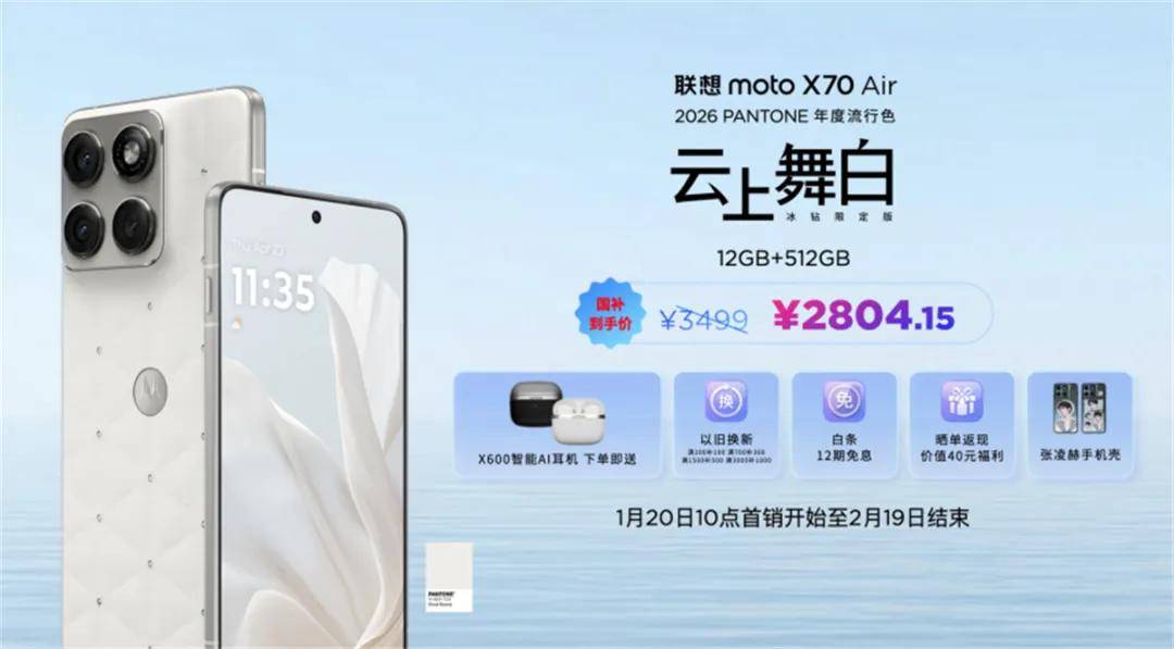 联想moto X70 Air云上舞白冰钻限定版价格为3499元,国补到手价仅约2804元。即日起下单用户除可享受首销四重礼遇外,还将获赠张凌赫同款专属手机壳,打造从内到外的完整高定体验。