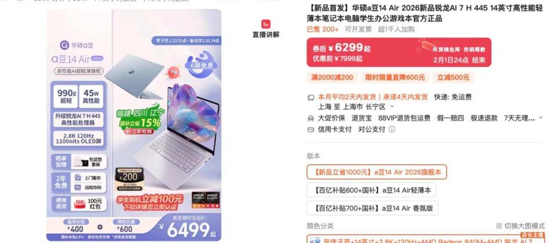 售后保障同样贴心,购机即享a豆无忧服务计划,涵盖2年硬件上门服务、2年无限远程协助、2年好屏无忧换新、2年整机保修服务,日常使用中遇到问题也能得到及时专业的解决方案,入手无后顾之忧。1月22日21:00,天猫现已正式开售,上天猫搜索“华硕a豆14 Air 2026”,直接享受补贴400元,首发限时优惠600元,更有学生购机立减100元优惠,到手券价6299元起,部分地区可以享受15%的国家补贴。