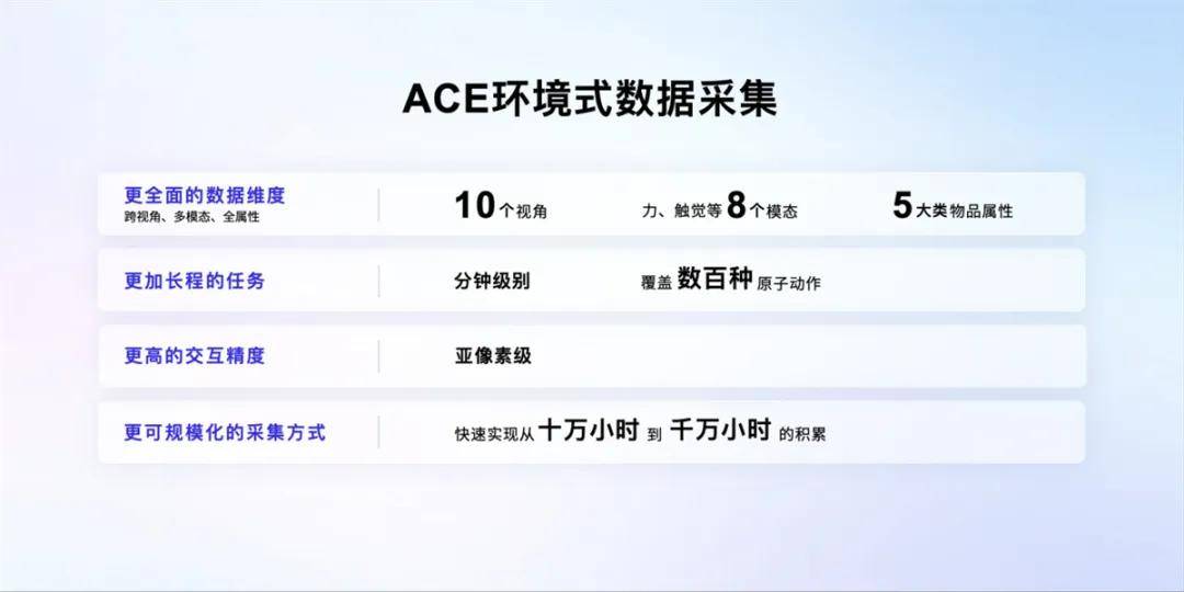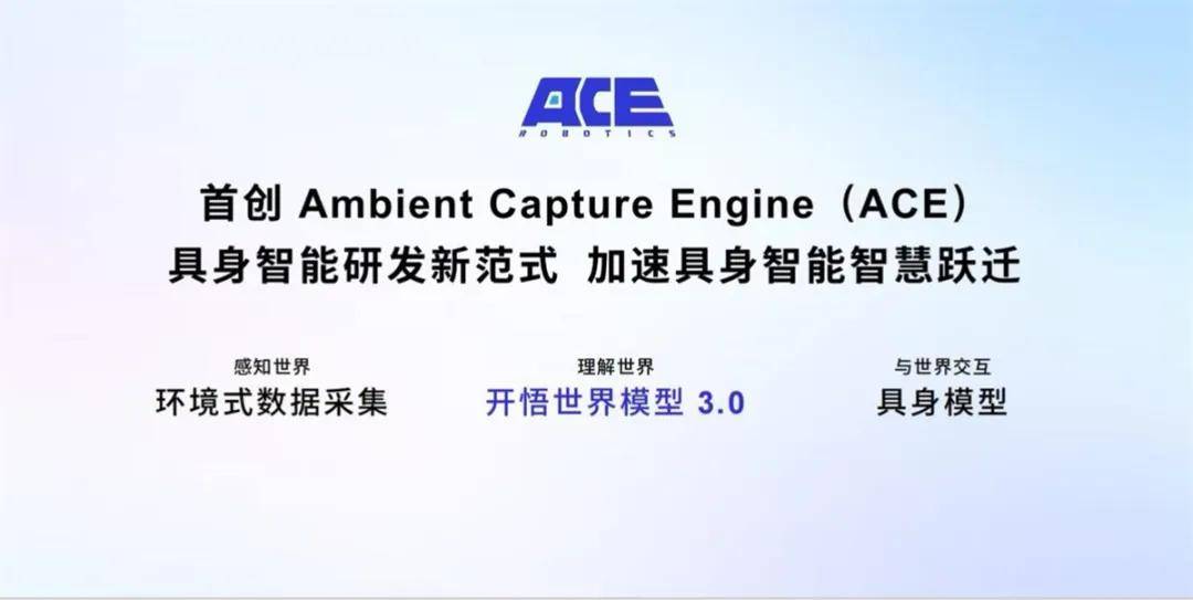 ACE研发范式彻底颠覆传统逻辑,将人类与物理世界的互动规律作为核心研究起点,以环境式数据采集为引擎,构建了一套从“环境式数据采集—开悟世界模型3.0—具身交互”的全链路技术体系。