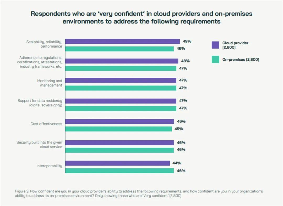 值得注意的是,区域差异折射出信任构建的阶段性特征。亚太地区尤其是中国在云应用开发普及率上领先全球,74%的企业在云上构建内部业务应用(欧洲71%、美洲62%)。这种领先并非盲目乐观,57%的亚太企业认为公有云在可扩展性、可靠性与性能方面最具优势,反映出企业对云原生价值的深度认同。当云成为创新的默认环境,信任便从“附加属性”升维为“战略基石”。