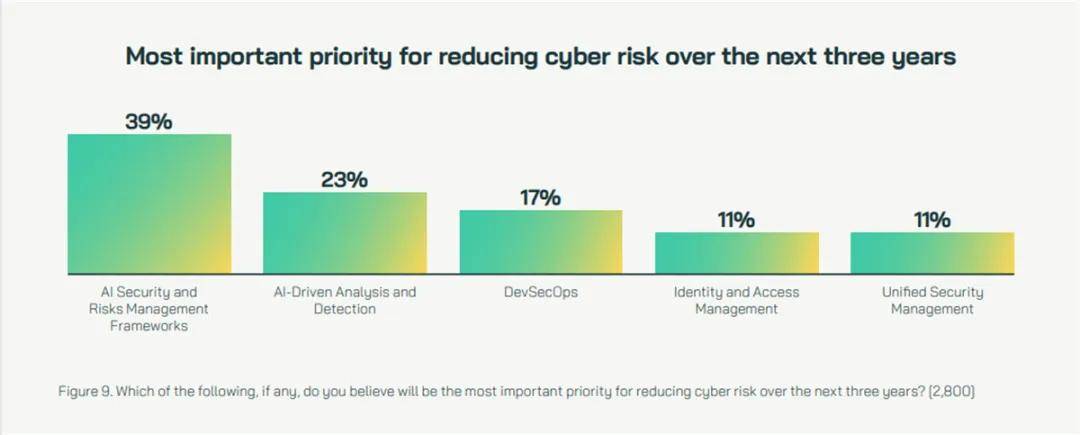 在本次调研报告中,39%的受访者将“AI安全与风险管理框架”列为未来三年降低网络风险的首要任务,23%强调AI驱动的分析与检测能力——企业正以治理先行的理性态度拥抱AI赋能。