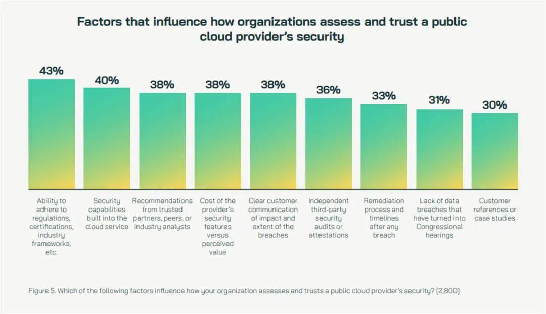 然而,信任的建立绝非一蹴而就。调研揭示,企业对云服务商的信任构建呈现“硬证据”与“软实力”双轨并行特征:43%的决策者看重监管合规性,40%关注内置安全能力与第三方审计;同时,38%强调事件沟通透明度,30%参考客户成功案例。这种多维验证机制,使信任从抽象概念转化为可衡量的行动指标。