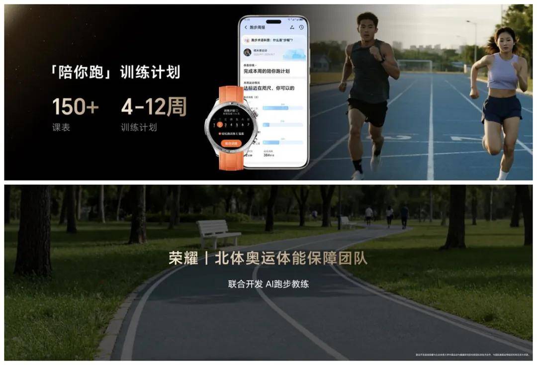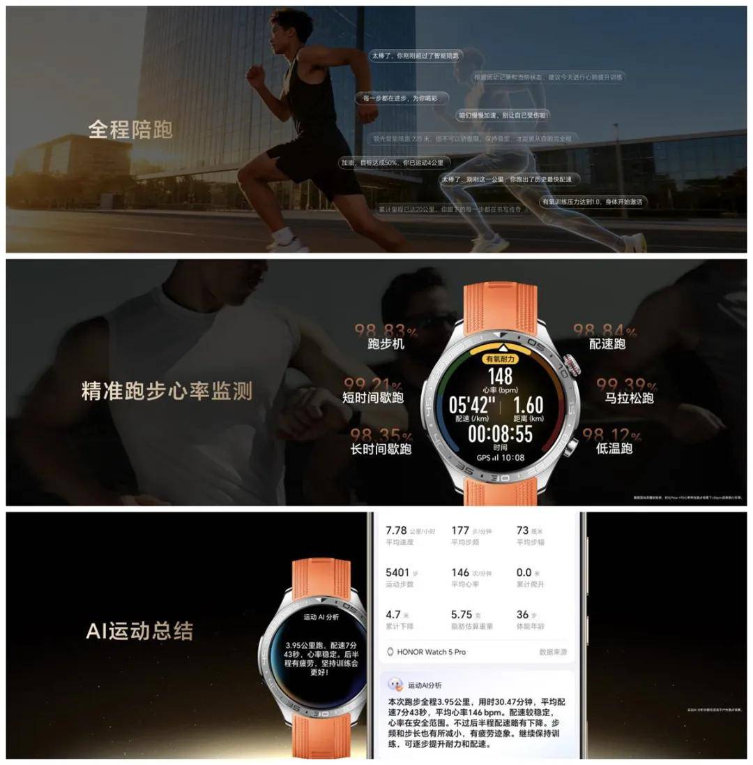 荣耀还联合北京体育大学奥运体能保障团队联合开发了AI跑步教练,将身体力量评估和大众跑者分级体系引入到产品功能之中,围绕跑步入门、健康保持和成绩提升三大目标,为不同阶段的跑者提供科学训练计划及课程。荣耀手表5 Pro还可以根据实际运动负荷监控、事物冲突、异常天气、女性生理周期、疲劳状态五大场景实时智能调整训练计划,为你打造专属的AI跑步教练。