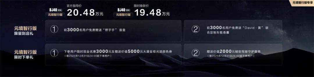 北京越野带来了元境智行版专享礼包:限量到店礼和限时下单礼。两项限量到店礼:前3000名用户,免费送“野乎乎”盲盒和北京越野与国际知名调香师David•黄联合定制的车载香囊。两项限时下单礼:第一项:从即刻起到年底下订用户,限时享现金优惠3000元;以及价值5000元的大漠金哑光漆颜色券。第二项:从即刻起到年底下定用户,限时赠送价值2000元的辅助驾驶守护服务。