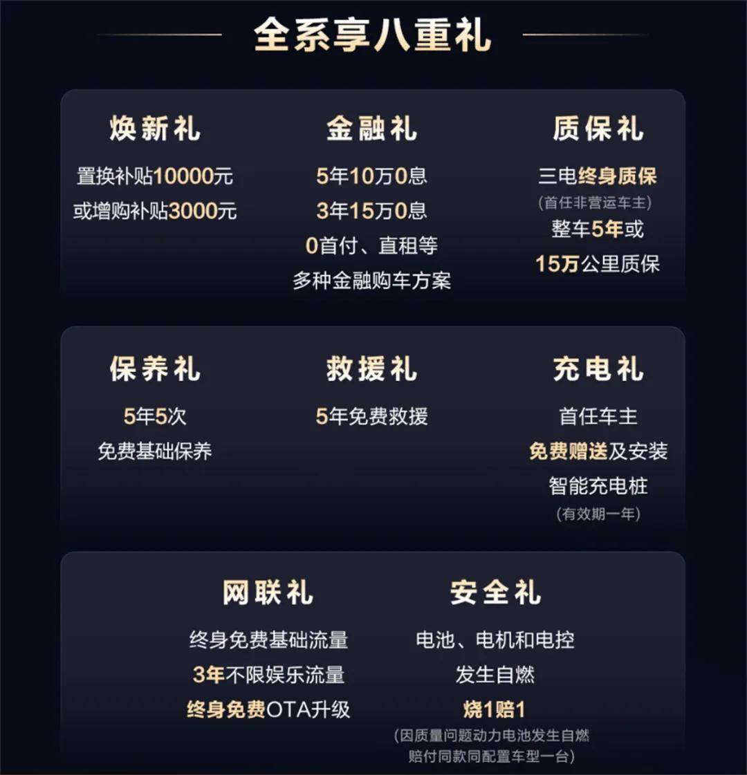 第八重,安全礼:电池、电机和电控发生自燃,烧1赔1(因质量问题动力电池发生自燃赔付同款同配置车型一台)。