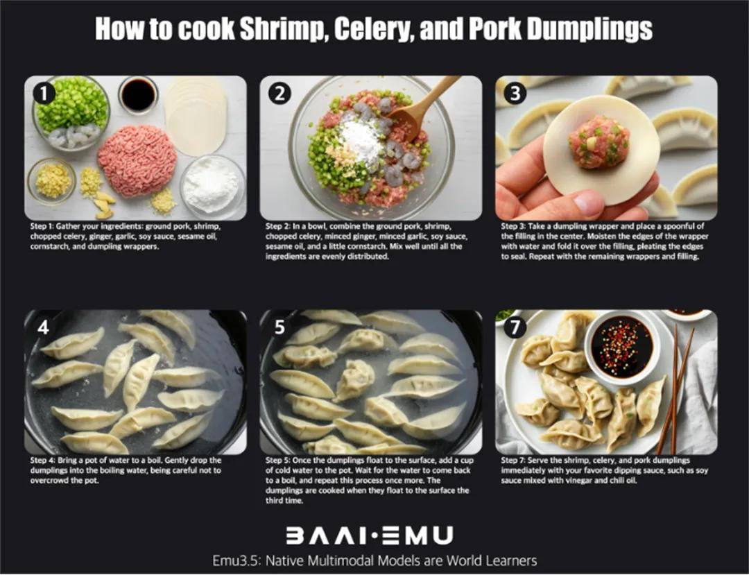 【Emu3.5 的多模态指导能力:输入“如何做芹菜饺子”,模型输出有步骤的图文指导】