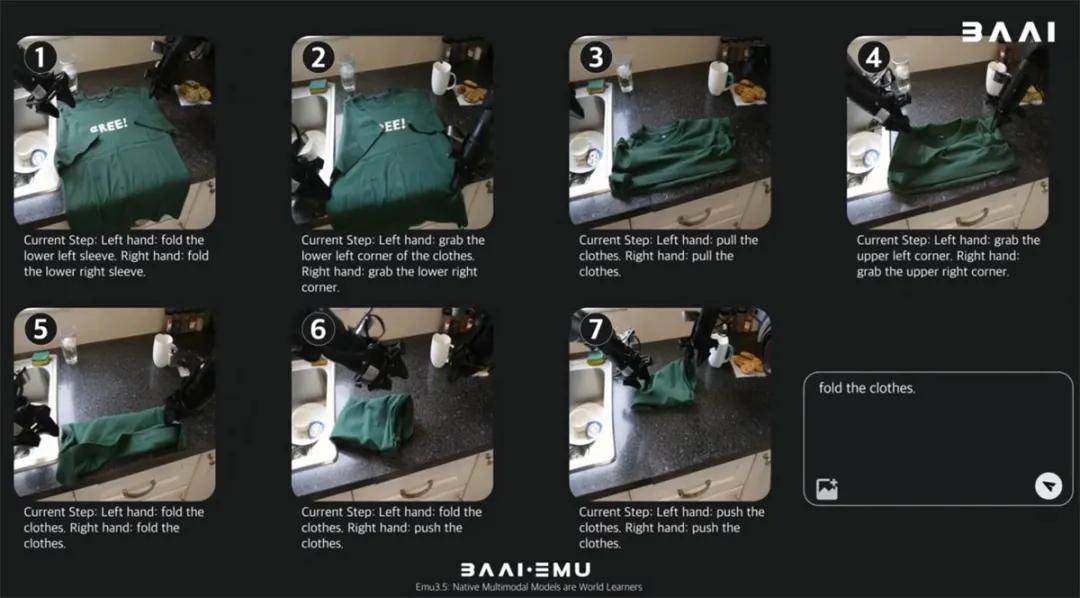 【只需一句“叠衣服”的简单指令,Emu3.5便能自主规划、拆解任务,并精确生成机器人完成一整套复杂的折叠动作】
